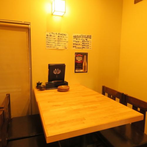 【半個室 4名テーブル×1卓のテーブル席】落ち着いた雰囲気の半個室席はゆったりお座りいただけるテーブル席。会社の同僚との飲み会やお仲間内での小宴会にも人気のお席です。飲み放題コースは5000円(税込)~ご用意しております☆